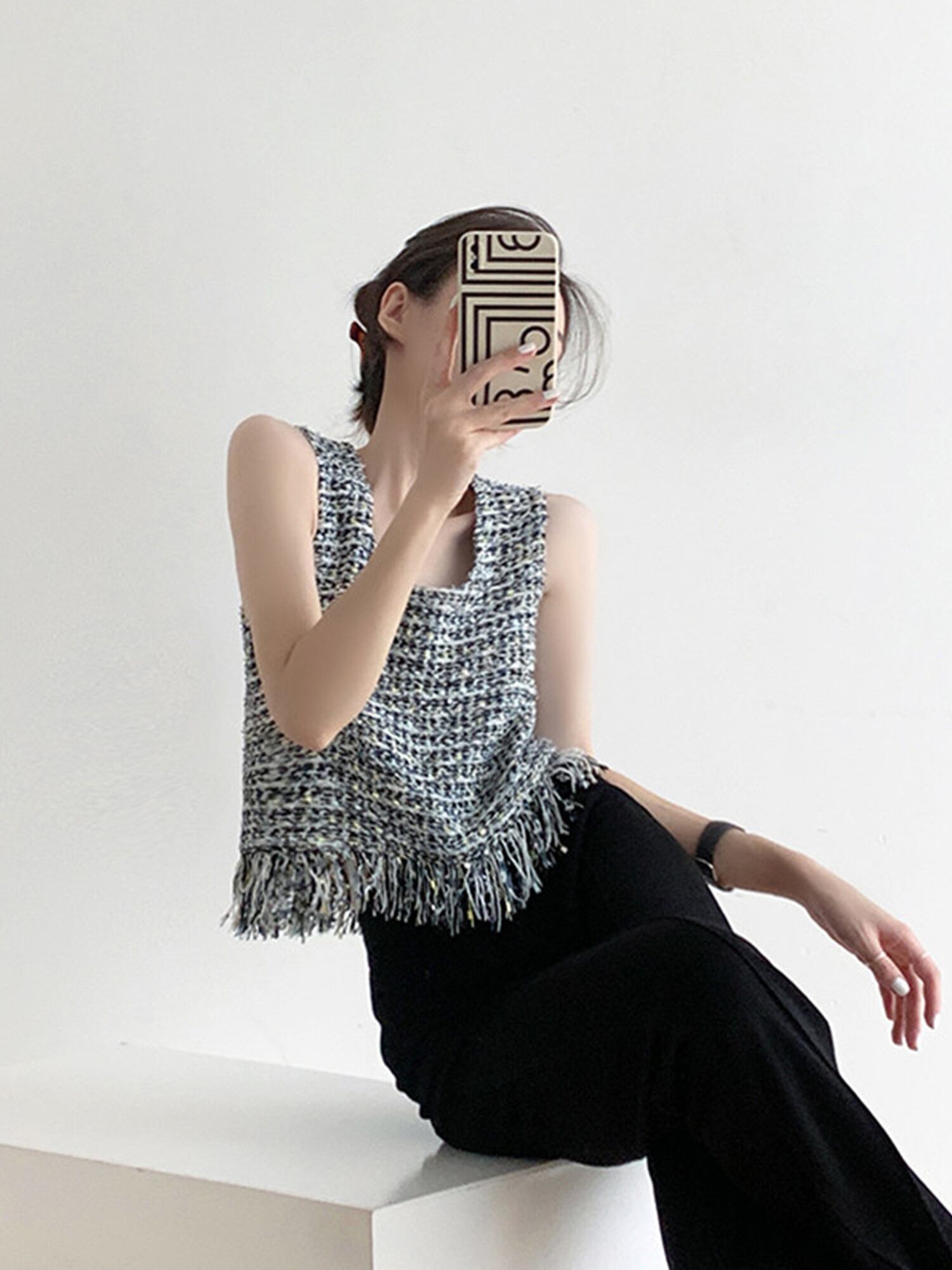 フリンジがあしらわれたツイードのトップス。