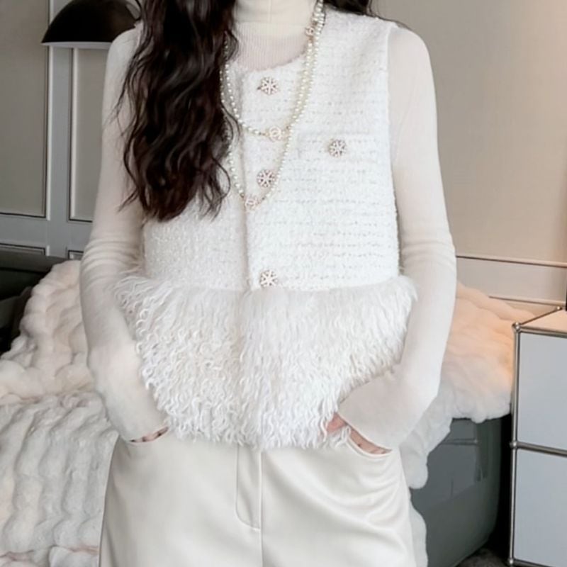 ふわふわとしたフリンジとビジューボタンが華やかなベストです。