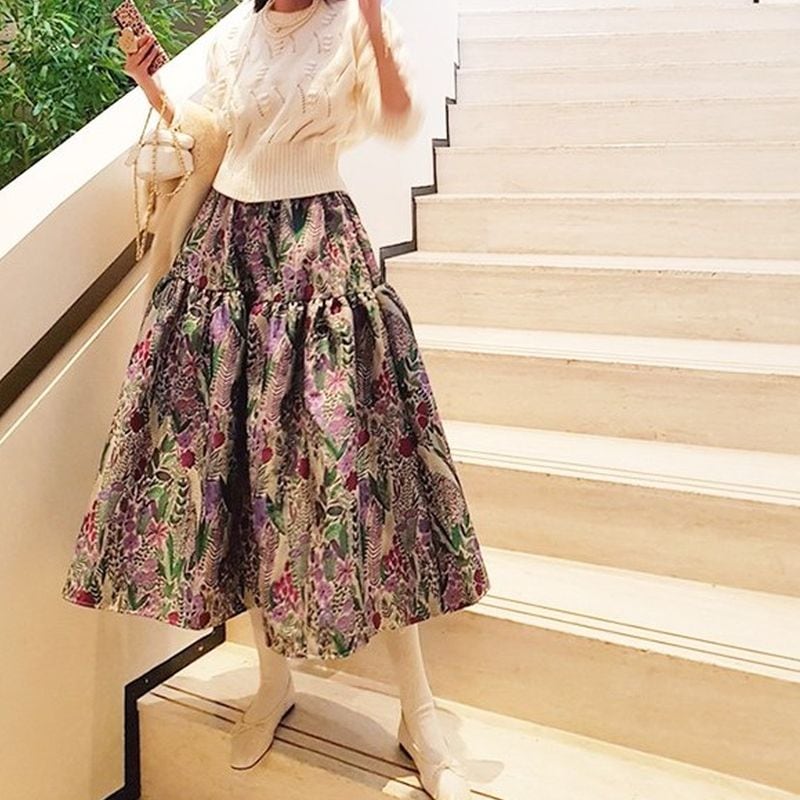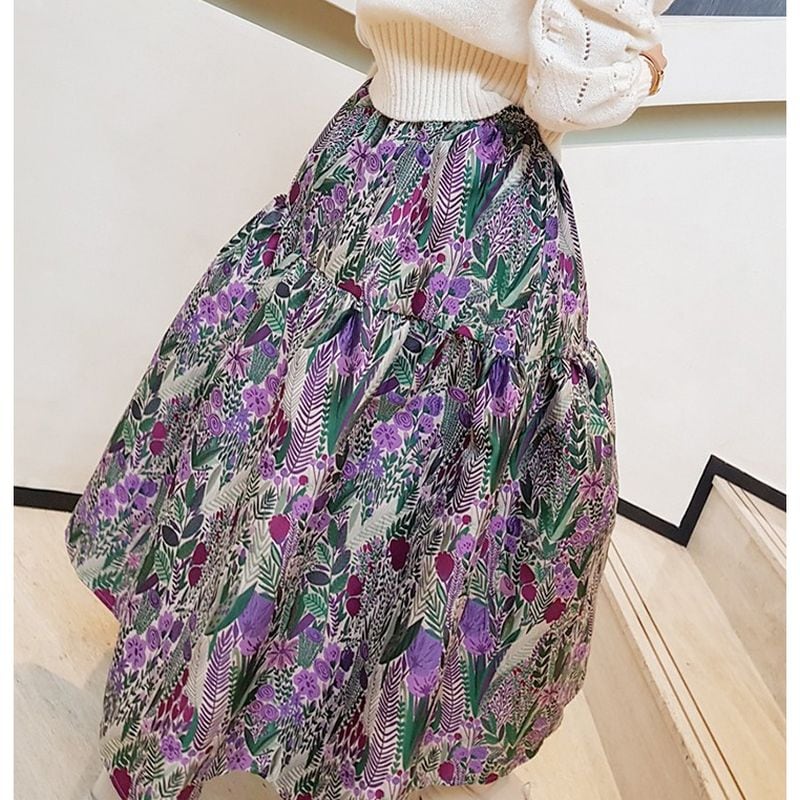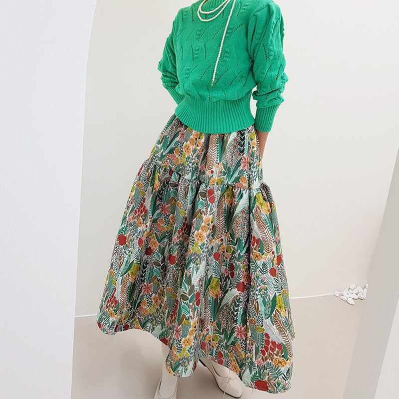鮮やかな総柄が華やかな印象のフレアスカートです。