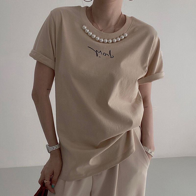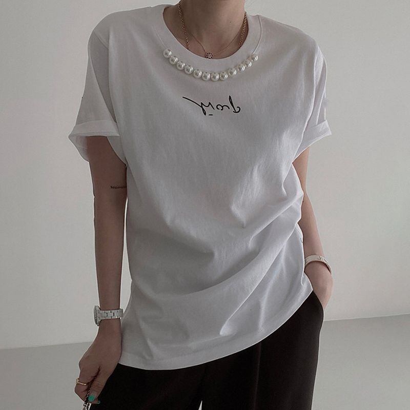 首元のパールがポイントのカジュアルな英字ロゴ入シンプルTシャツです。