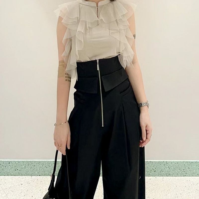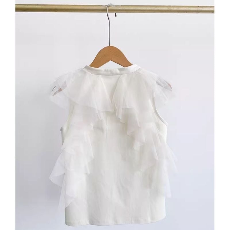 ノースリーブシャツに軽やかなチュールフリルを施したエレガントムード漂うトップスです。