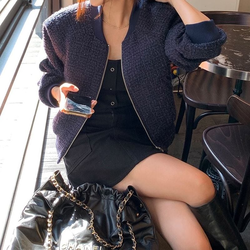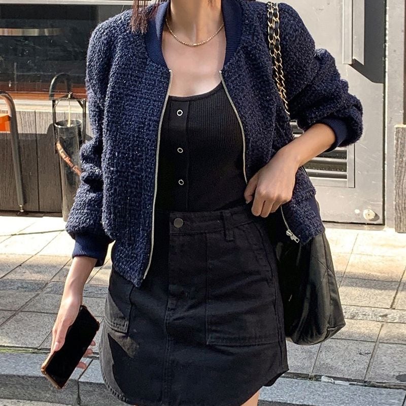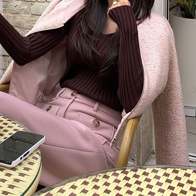 ノーカラーなので首回りスッキリ。ショート丈なのでワンピースやハイウエストボトムなどともバランスよく着用いただけます。